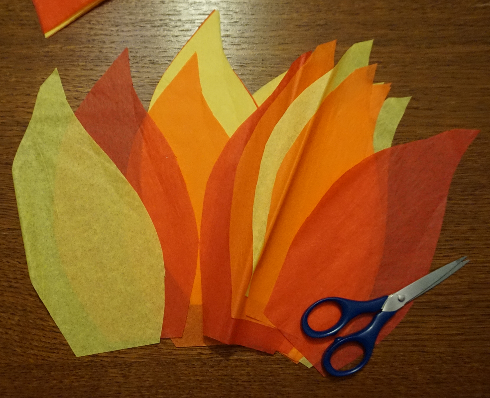 Distribuer la visite guidée d’Exode 3.1-9, des feuilles de papier, des crayons de couleurs et une dizaine de « flammes en papier ».